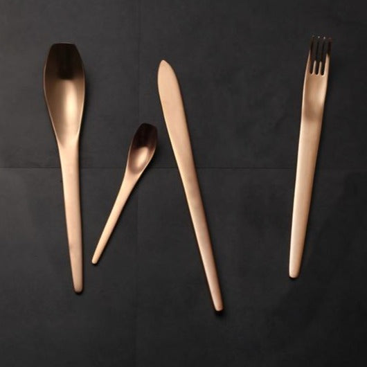 Elevate every dining experience with sleek rose gold-tone stainless steel cutlery. These Japanese-style dining utensils offer eye-pleasing aesthetics, smooth edges, and quality craftsmanship. Frosted rose gold gives this striking set a gorgeous modern finish. 4 pieces set include Knife, Fork, Spoon, and Coffee Spoon. Choose a set of 4 or 16.